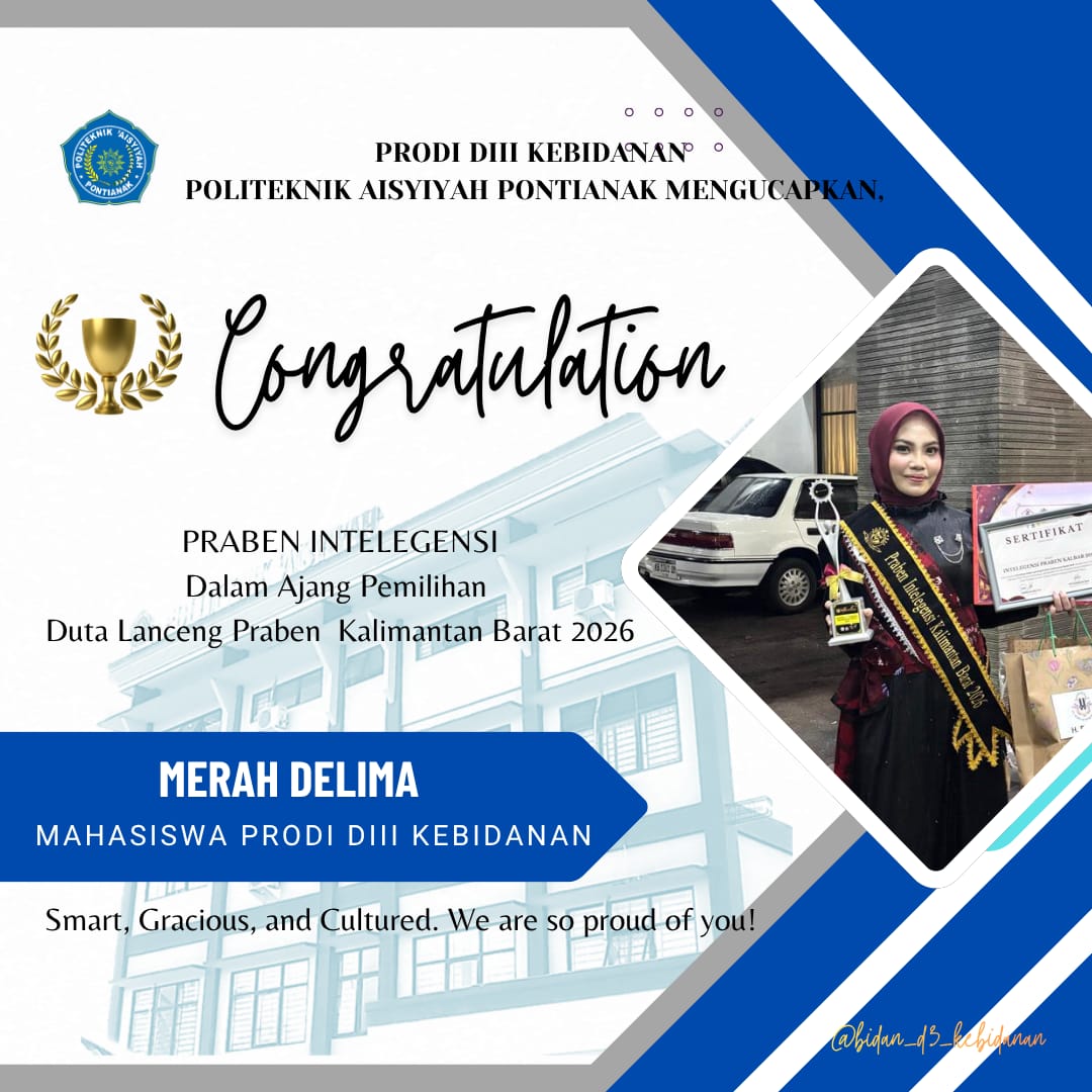 Mahasiswa Program Studi DIII Kebidanan Politeknik Aisyiyah Pontianak kembali menorehkan prestasi membanggakan. Merah Delima, salah satu mahasiswa berprestasi, berhasil masuk dalam kategori Praben Intelegensi pada ajang Duta Lanceng Praben Kalimantan Barat 2026. Pencapaian ini menjadi bukti nyata bahwa mahasiswa kebidanan tidak hanya unggul dalam bidang akademik dan keterampilan klinis, tetapi juga memiliki kapasitas intelektual, kepercayaan diri, serta kemampuan komunikasi yang baik di tingkat provinsi.